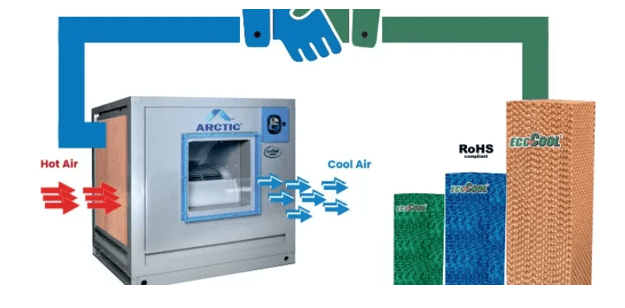 It reduces air temperature using natural evaporation, making it energy-efficient and suitable for large spaces.